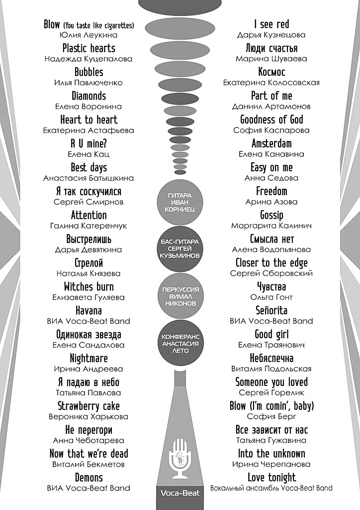 Да-да, это был самый настоящий музыкальный фестиваль проекта Voca-Beat, в котором приняли участие артисты различных форматов: вокалисты, музыканты, танцоры и даже целые команды - и все это в сопровождении просто сумасшедшего уровня рок-бэнда!