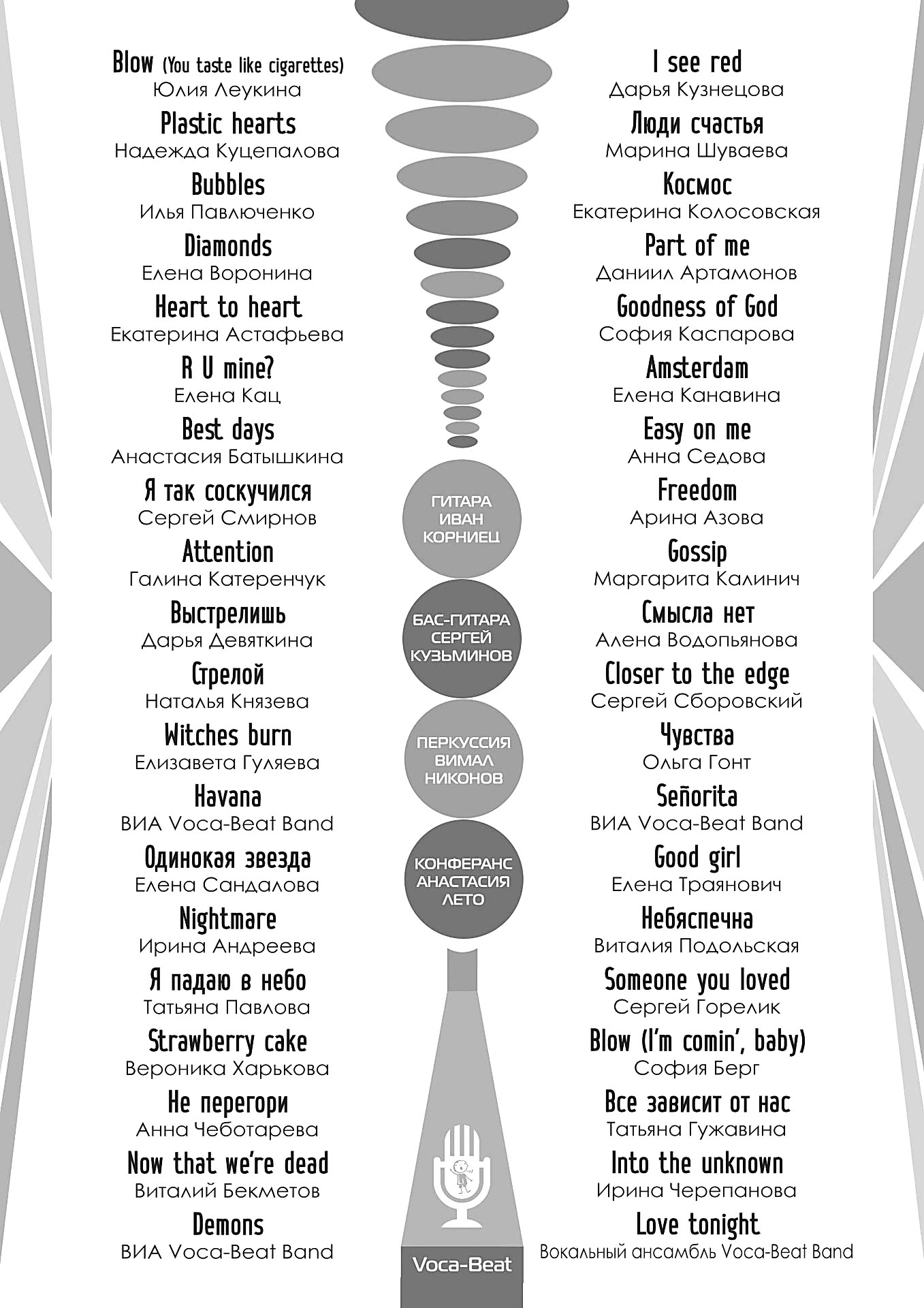 Да-да, это был самый настоящий музыкальный фестиваль проекта Voca-Beat, в котором приняли участие артисты различных форматов: вокалисты, музыканты, танцоры и даже целые команды - и все это в сопровождении просто сумасшедшего уровня рок-бэнда!